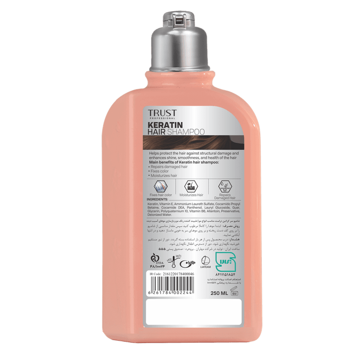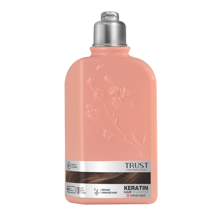 شامپو سر کراتین تراست، با دارا بودن کراتین و ویتامین E، با نرم کردن مو و کمک به استحکام ساختاری آن، مانع از شکستگی و آسیب تارهای مو میشود. این شامپو ضمن رفع وزی تارهای مو، به تثبیت رنگ، ترمیم و افزایش ضخامت مو کمک میکند.