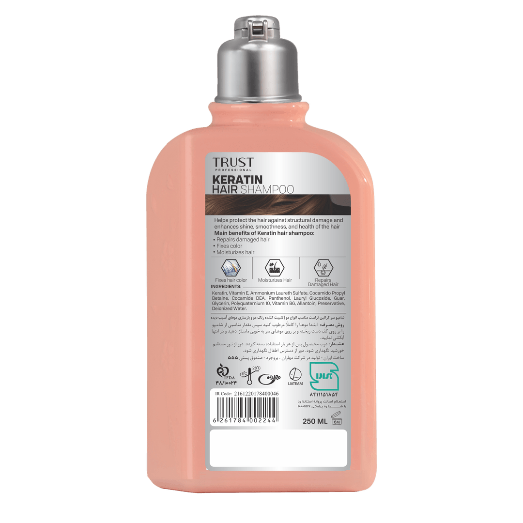 شامپو سر کراتین تراست، با دارا بودن کراتین و ویتامین E، با نرم کردن مو و کمک به استحکام ساختاری آن، مانع از شکستگی و آسیب تارهای مو میشود. این شامپو ضمن رفع وزی تارهای مو، به تثبیت رنگ، ترمیم و افزایش ضخامت مو کمک میکند.